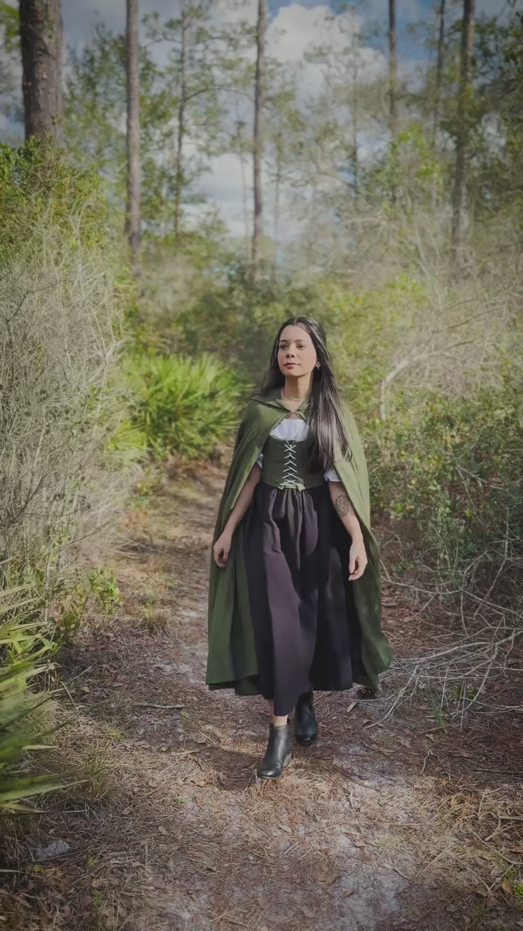 Woman in a green cloak and dark dress standing in a forest